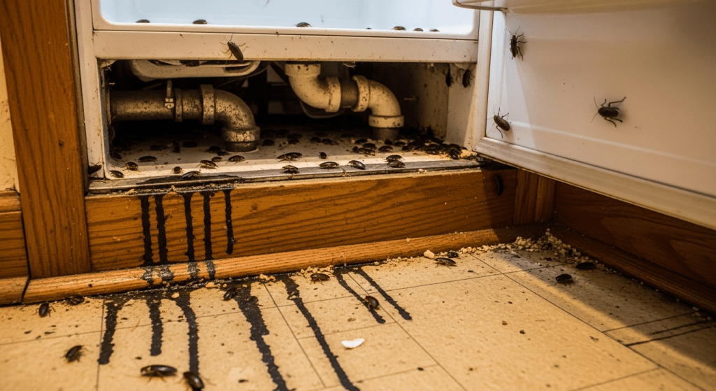 - Cockroach sightings at night in the kitchen or bathroom